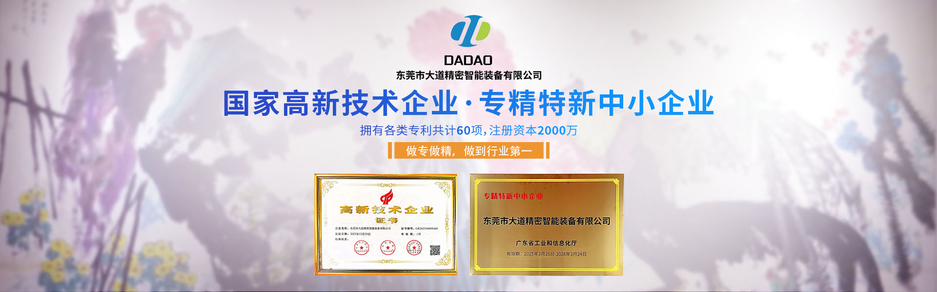 大道精密成立于2019年,公司注冊資本1000萬元,擁有辦公室、廠房等18,000多平方米。已通過ISO9001:2015國際質量管理體系認證,擁有國家各類專利共計58項,獲得“中國大道.商標”和“一帶一路十周年 .國禮品牌”等榮譽稱號,屬于國家高新技術企業,專精特新中小企業。2023年4月成立了“東莞市大道精密智能裝備有限公司關心下一代工作委員會”,是東莞市企石鎮工商聯副會長單位、東莞市企石鎮文學藝術界聯合會副主席單位、東莞市環保包裝行業協會副會長單位、東莞市數控裝備行業協會第二屆會長單位、廣東省包裝技術協會常務理事單位、廣東省膠粘劑行業協會理事單位、國家標準《機械安全中安全防護授權系統的基本要求》起草單位。